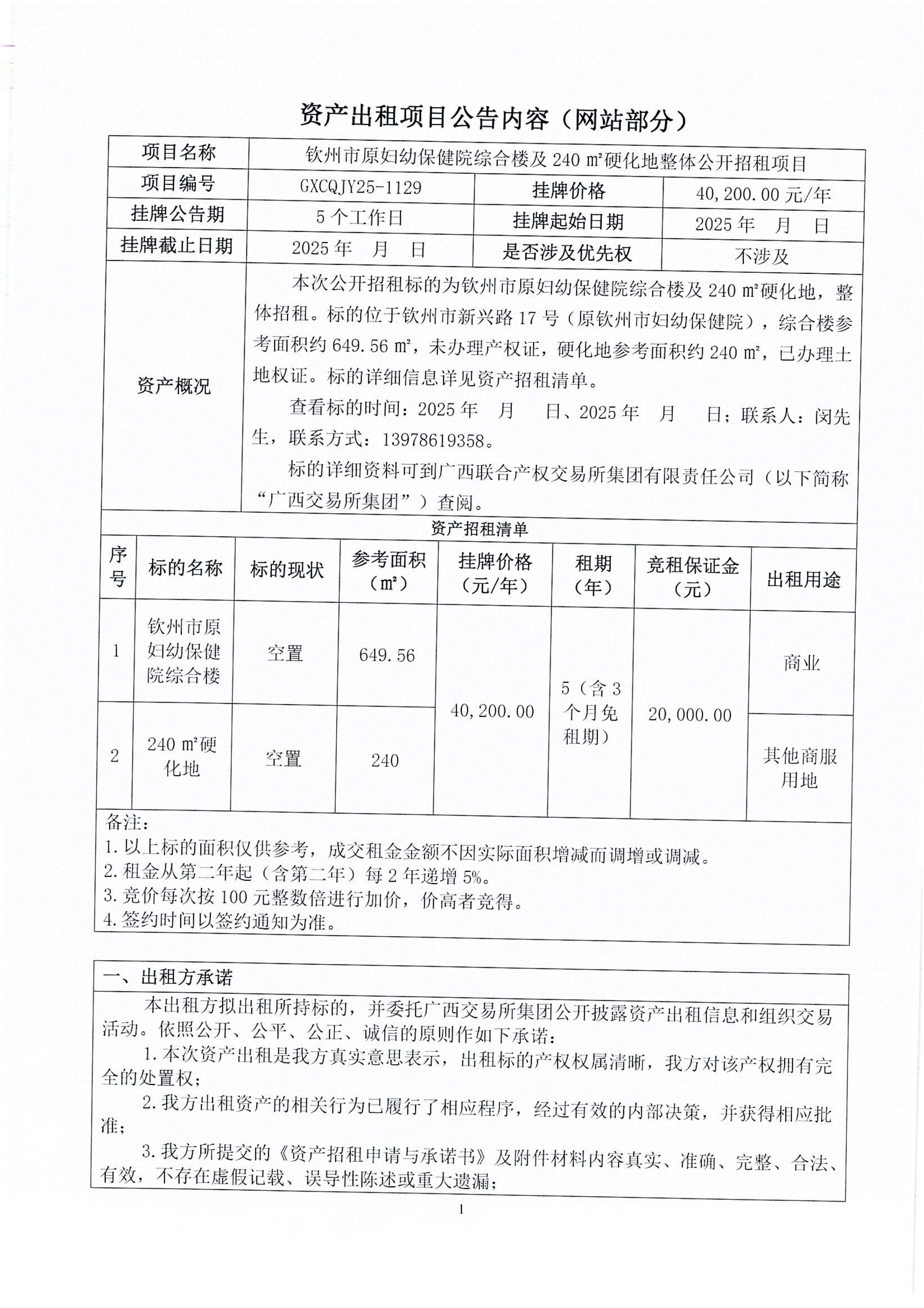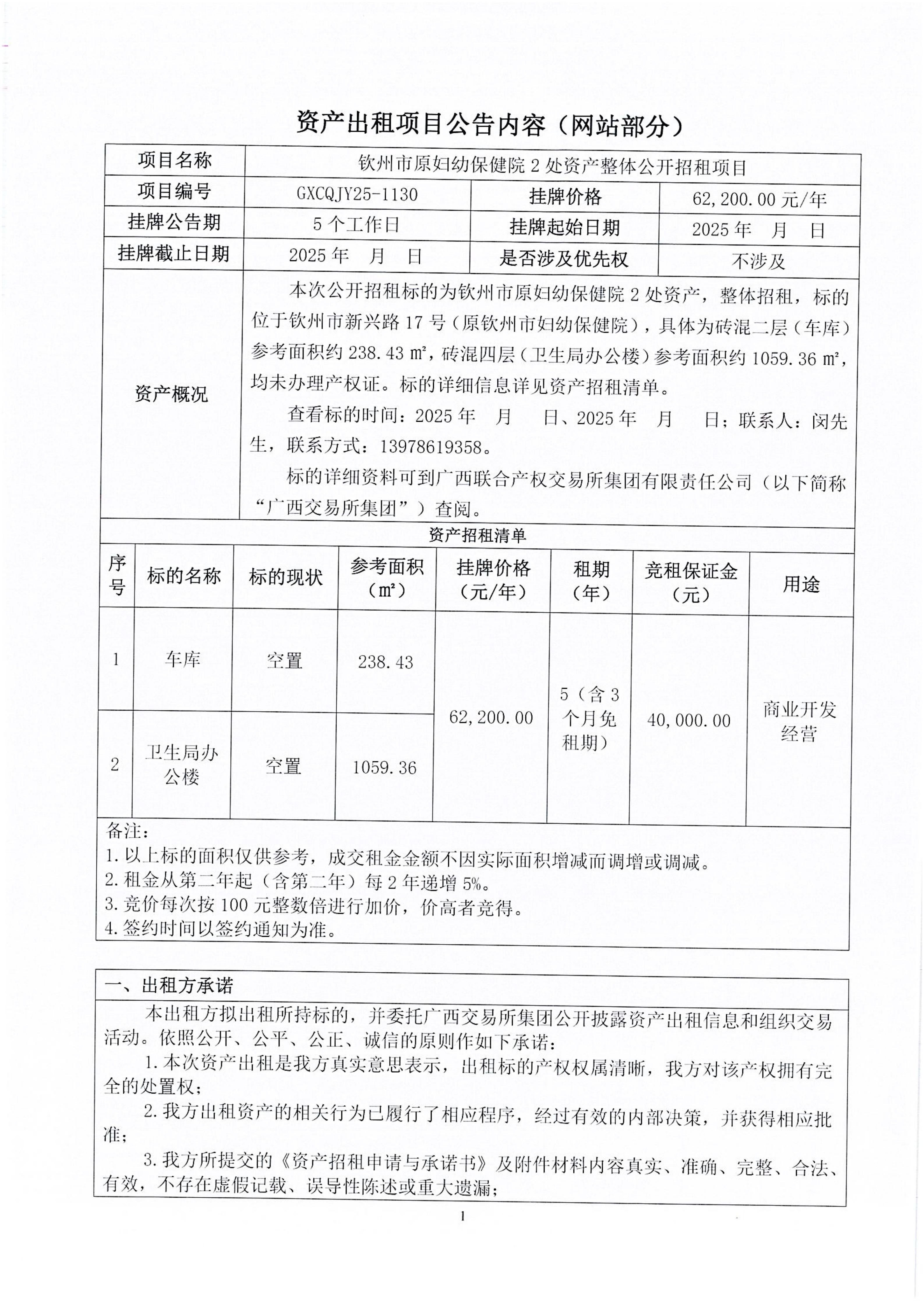 欽州市原婦幼保健院2處資產(chǎn)整體公開招租項目
