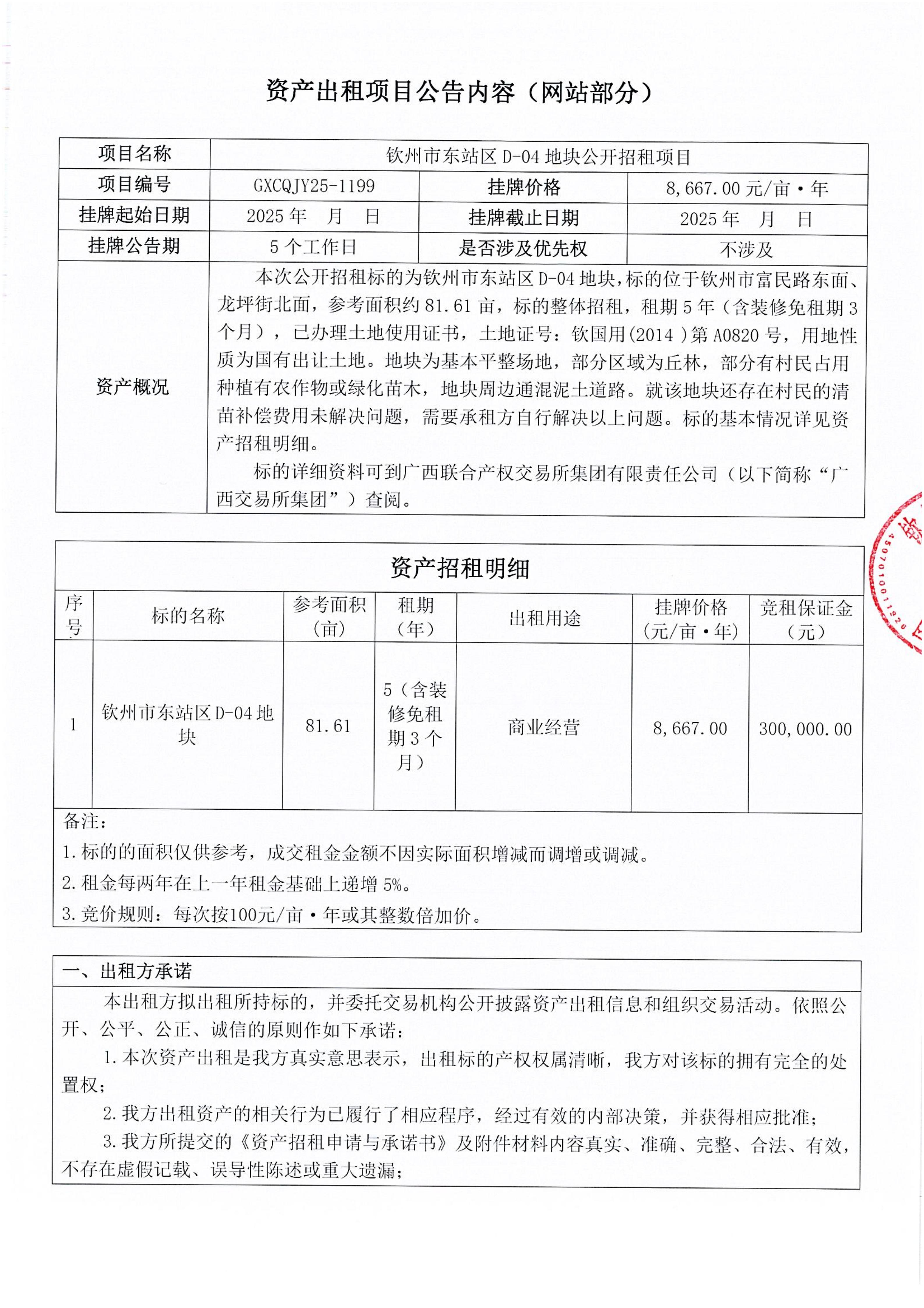 拍賣公告(欽州市安州大道西面、站前路南側(cè)6畝土地的5年租賃權(quán))