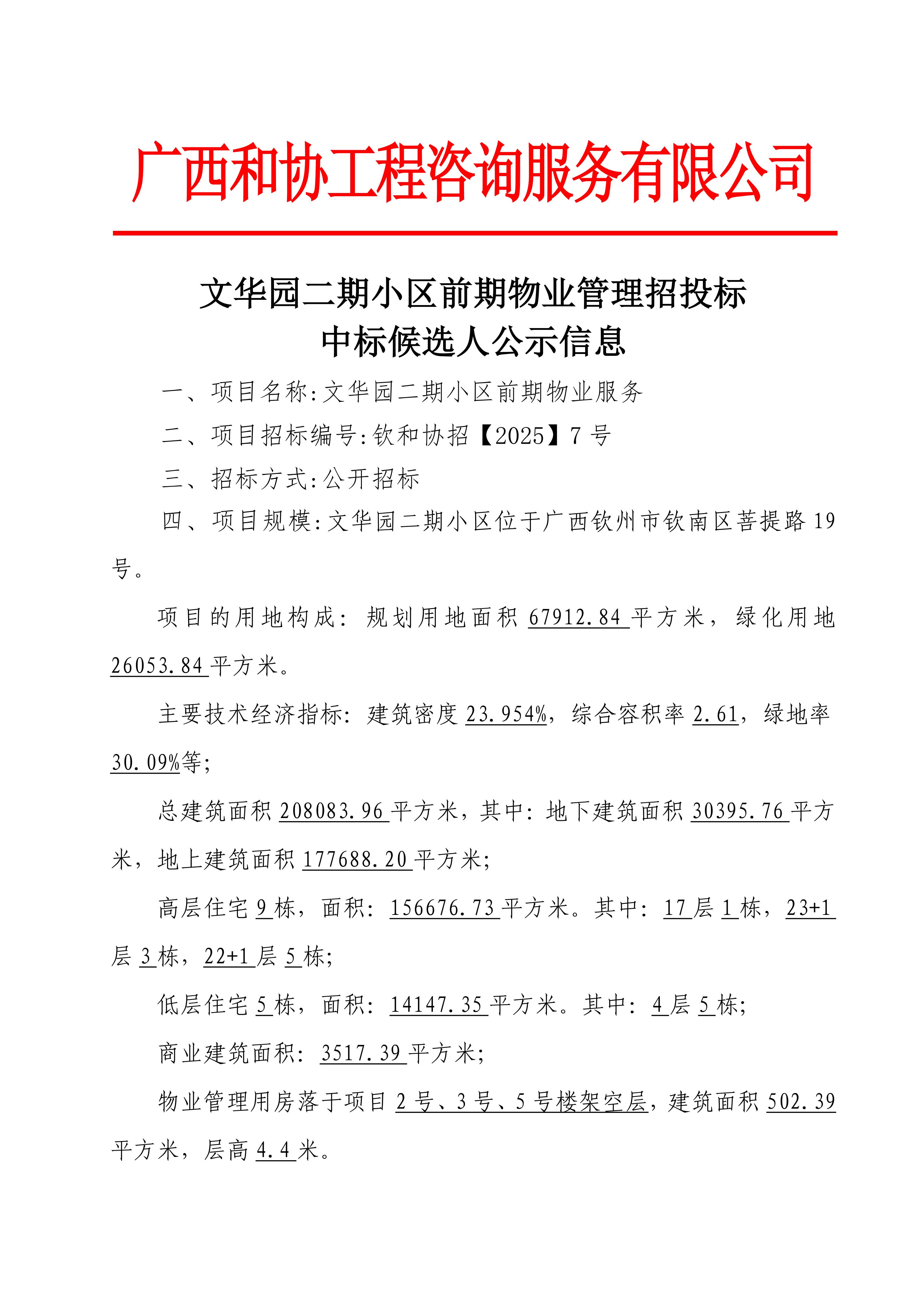 文華園二期小區(qū)前期物業(yè)管理招投標中標候選人公示信息