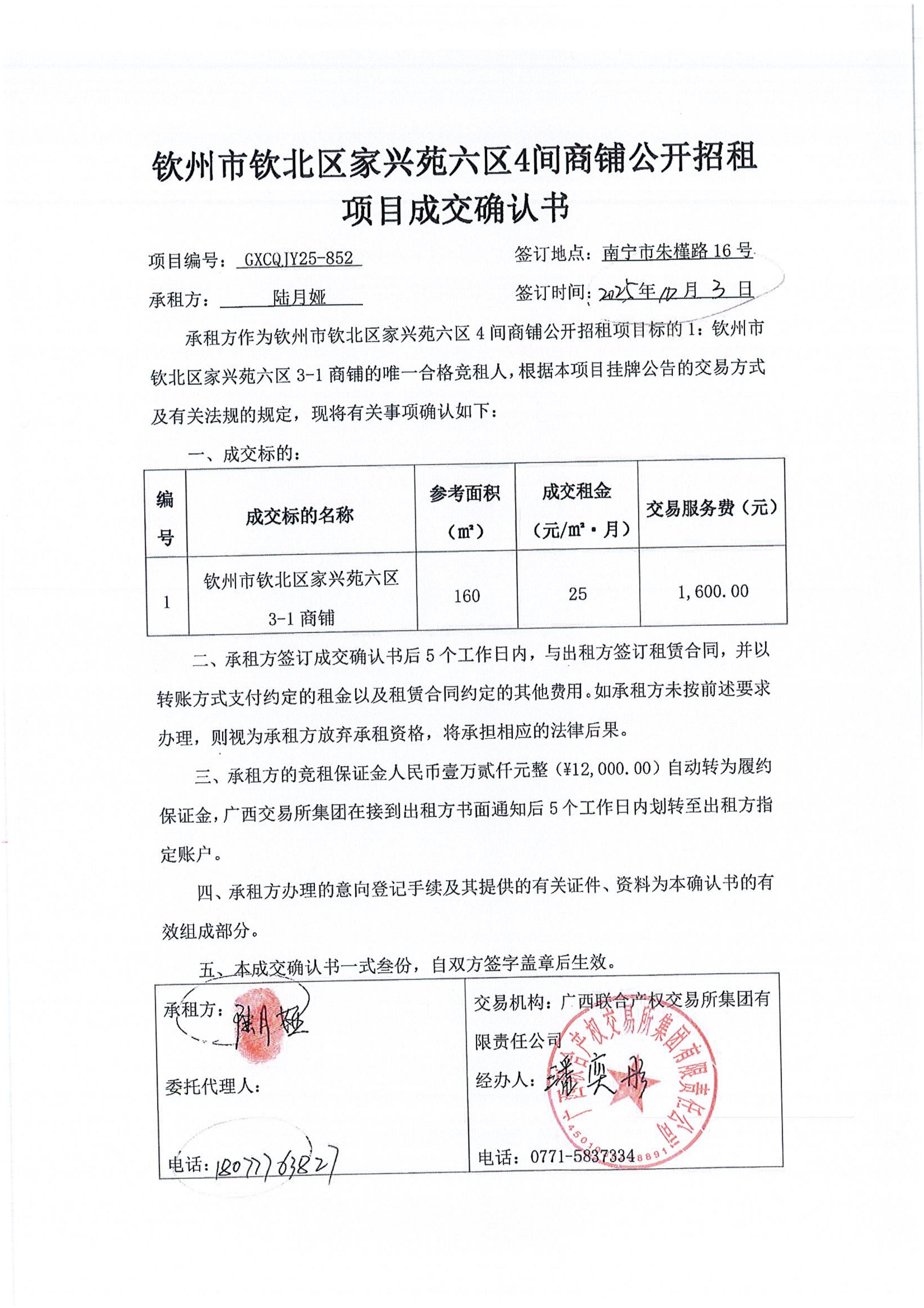 欽州市欽北區(qū)家興苑六區(qū)4間商鋪公開招租 項(xiàng)目成交確認(rèn)書
