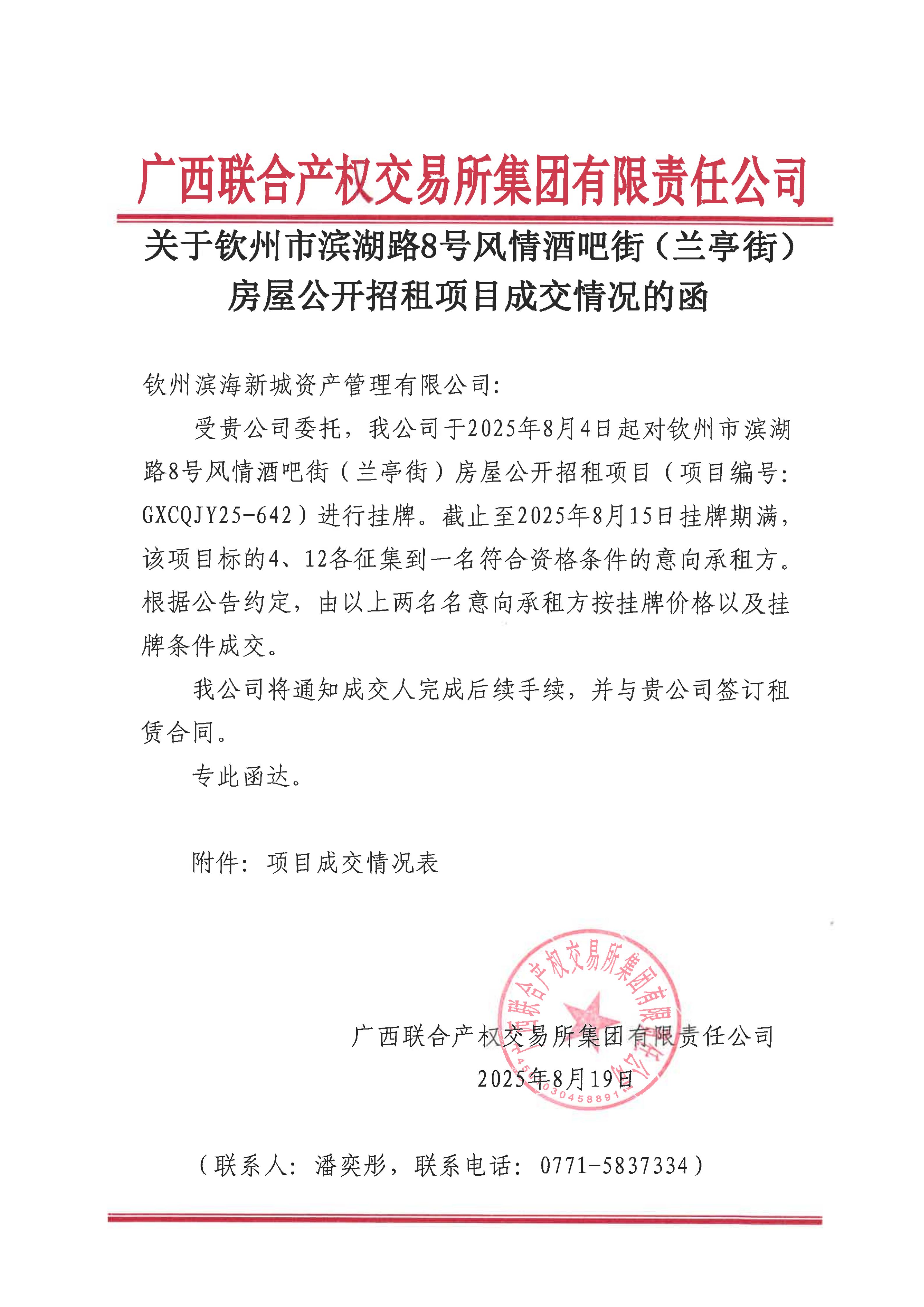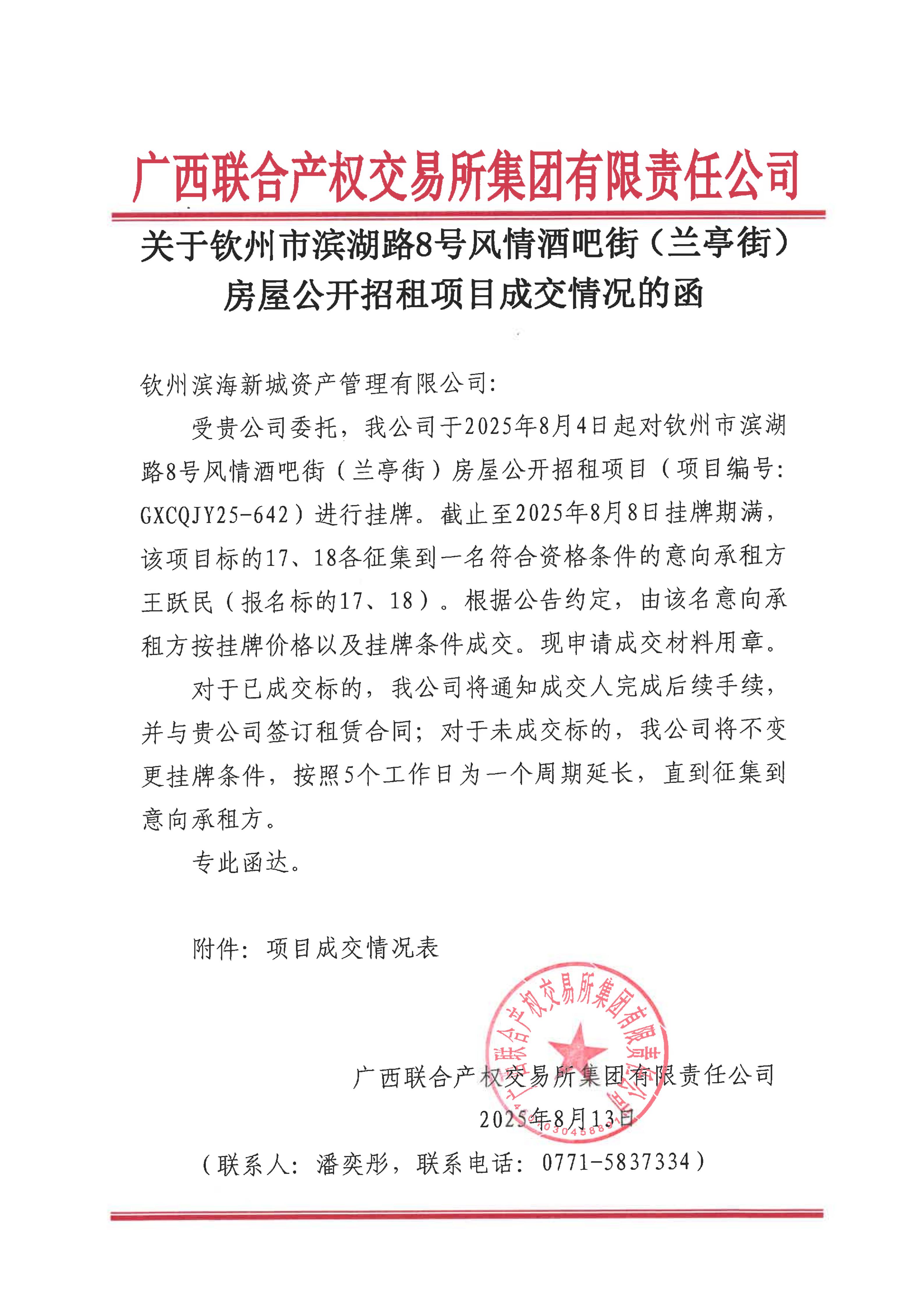 關于欽州市濱湖路8號風情酒吧街(蘭亭街)房屋公開招租項目成交情況的函(...