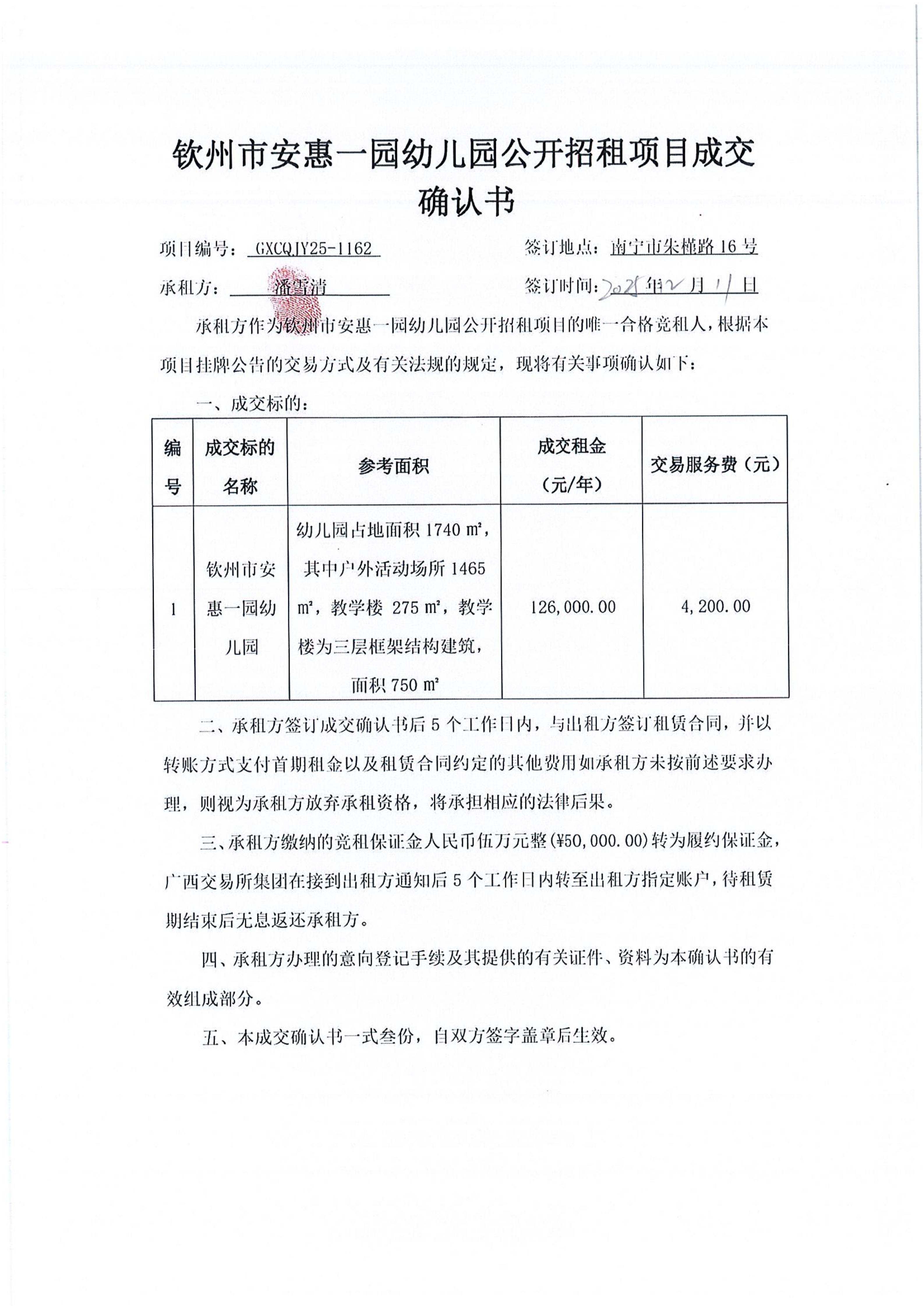 欽州市安惠一園幼兒園公開招租項目成交 確認書