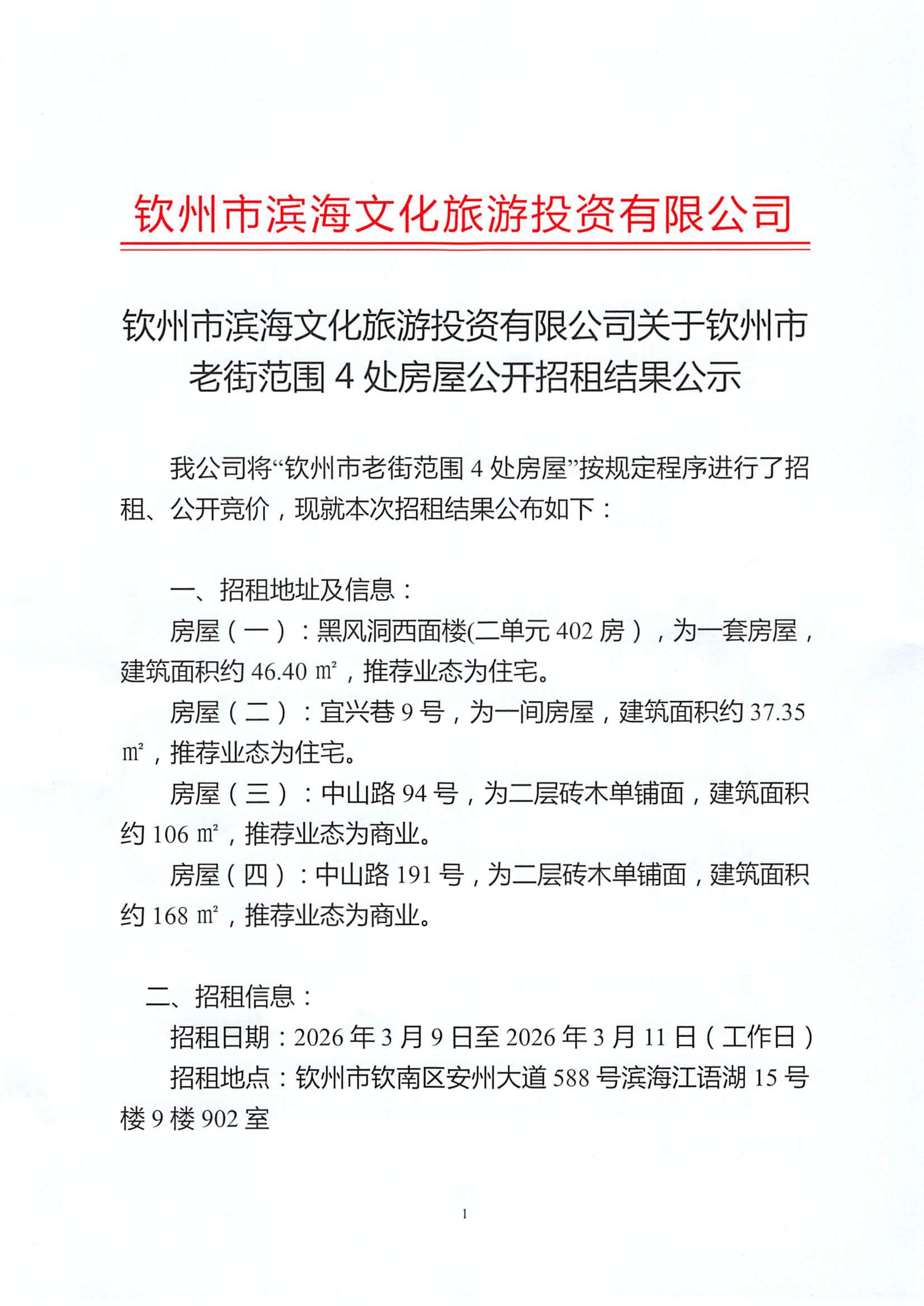 欽州市濱海文化旅游投資有限公司關(guān)于欽州市老街范圍房屋公開招租結(jié)果公示(...