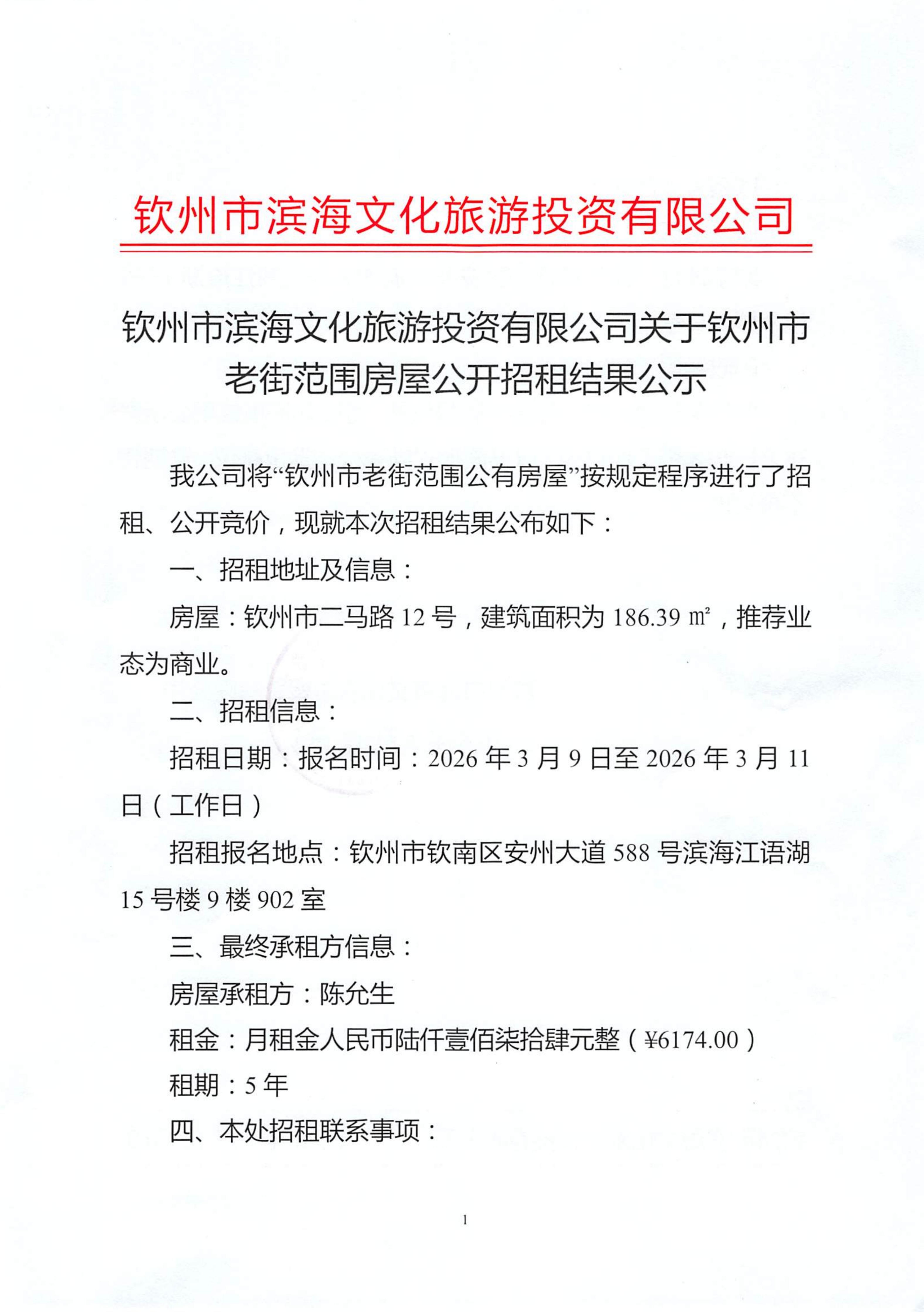 欽州市濱海文化旅游投資有限公司關(guān)于欽州市老街范圍兩處房屋公開招租結(jié)果公...