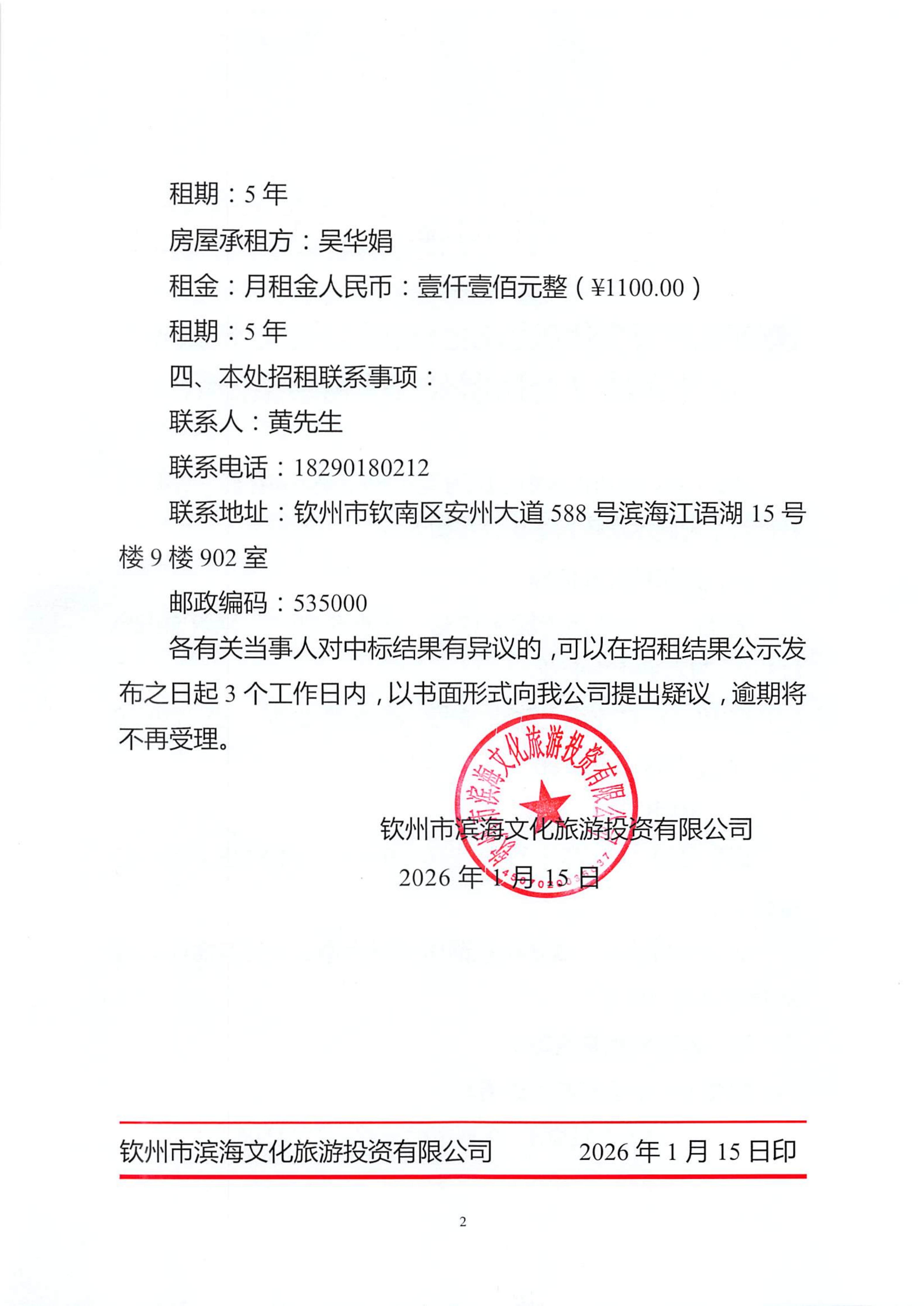 欽州市濱海文化旅游投資有限公司關(guān)于欽州市老街范圍2處房屋公開招租結(jié)果公示