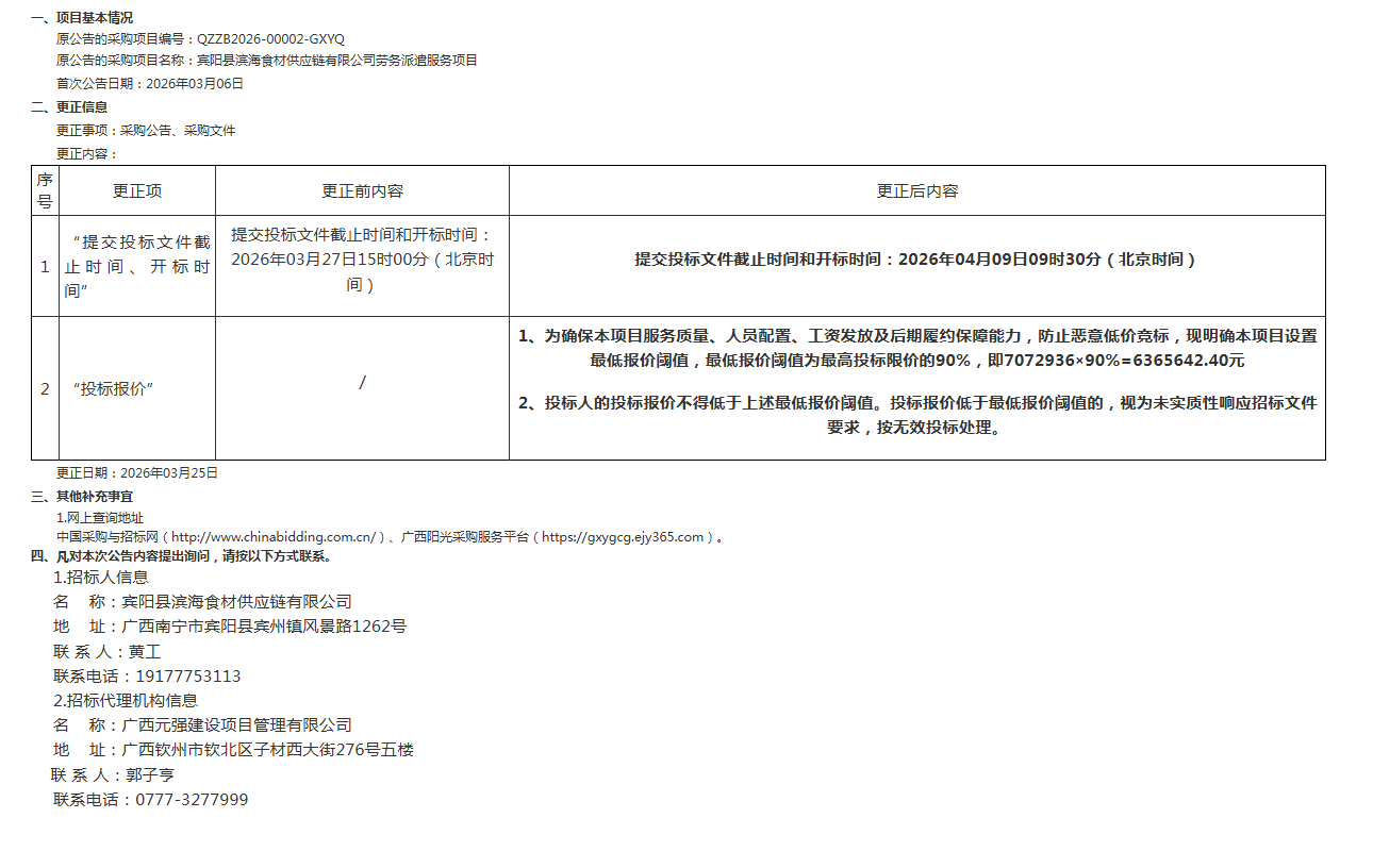 廣西元強建設(shè)項目管理有限公司關(guān)于賓陽縣濱海食材供應(yīng)鏈有限公司勞務(wù)派遣服務(wù)項目的更正公告(二)